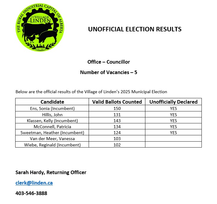 October 20 – Election Day, voting at the Linden Community Centre from 10 am – 8 pm.